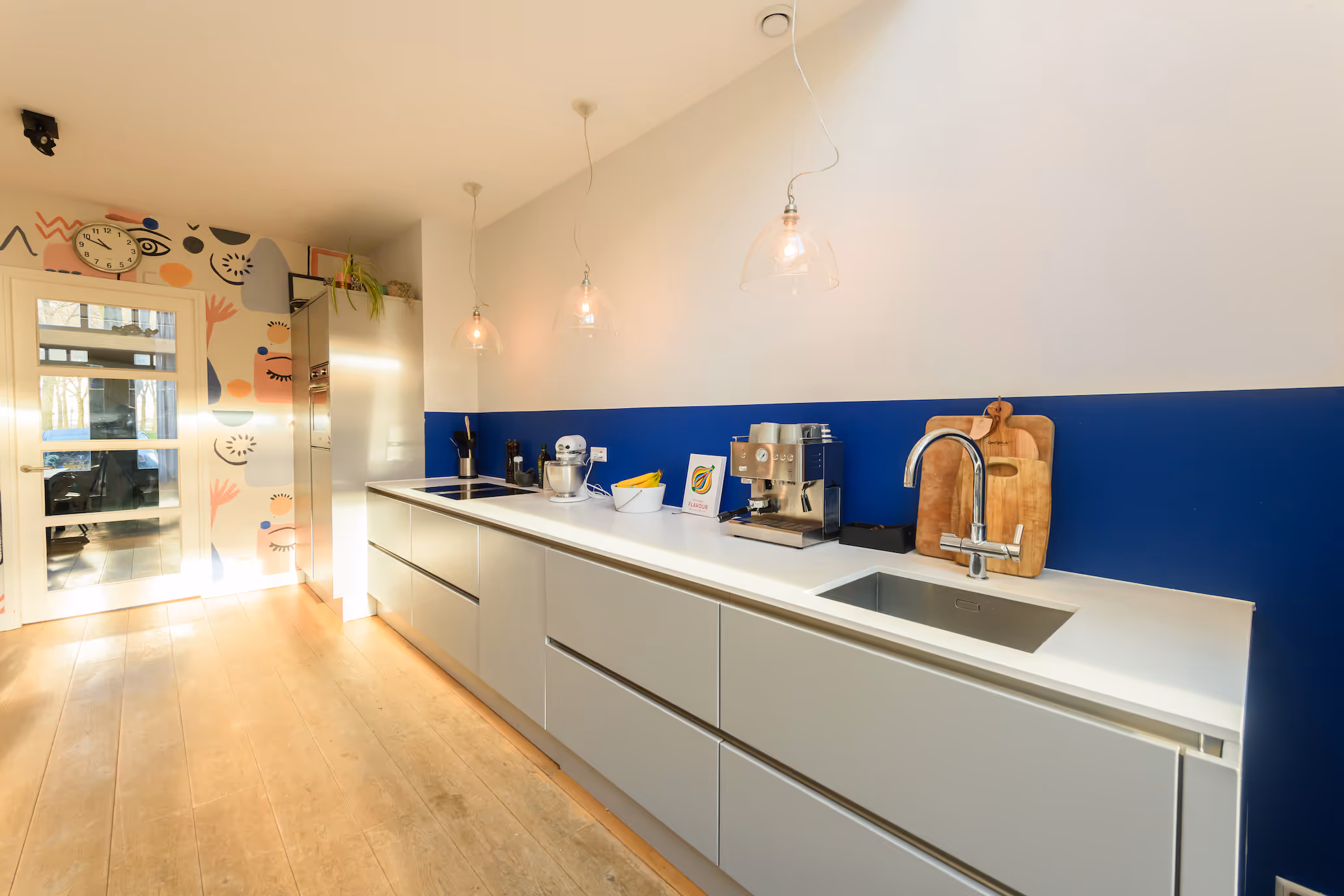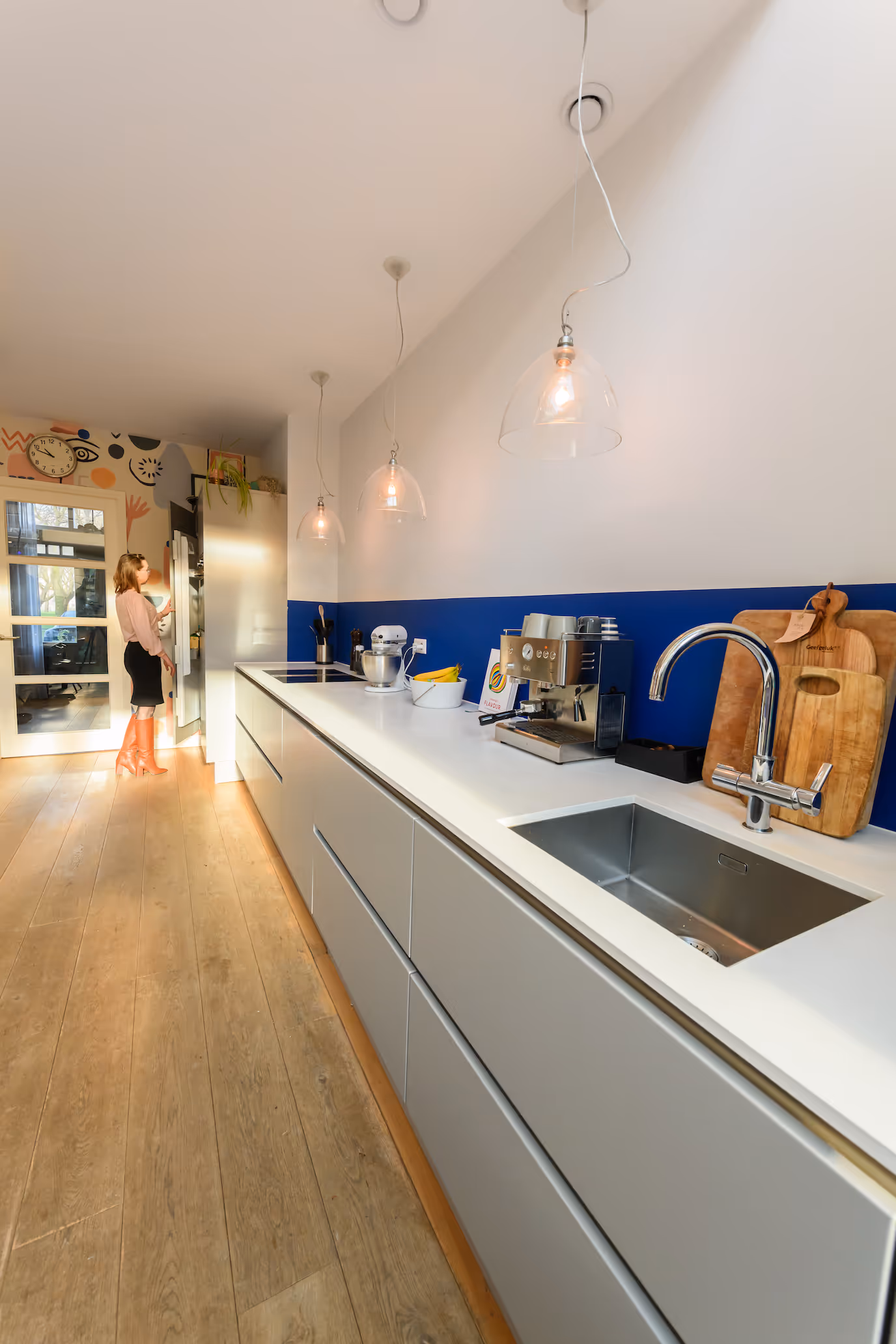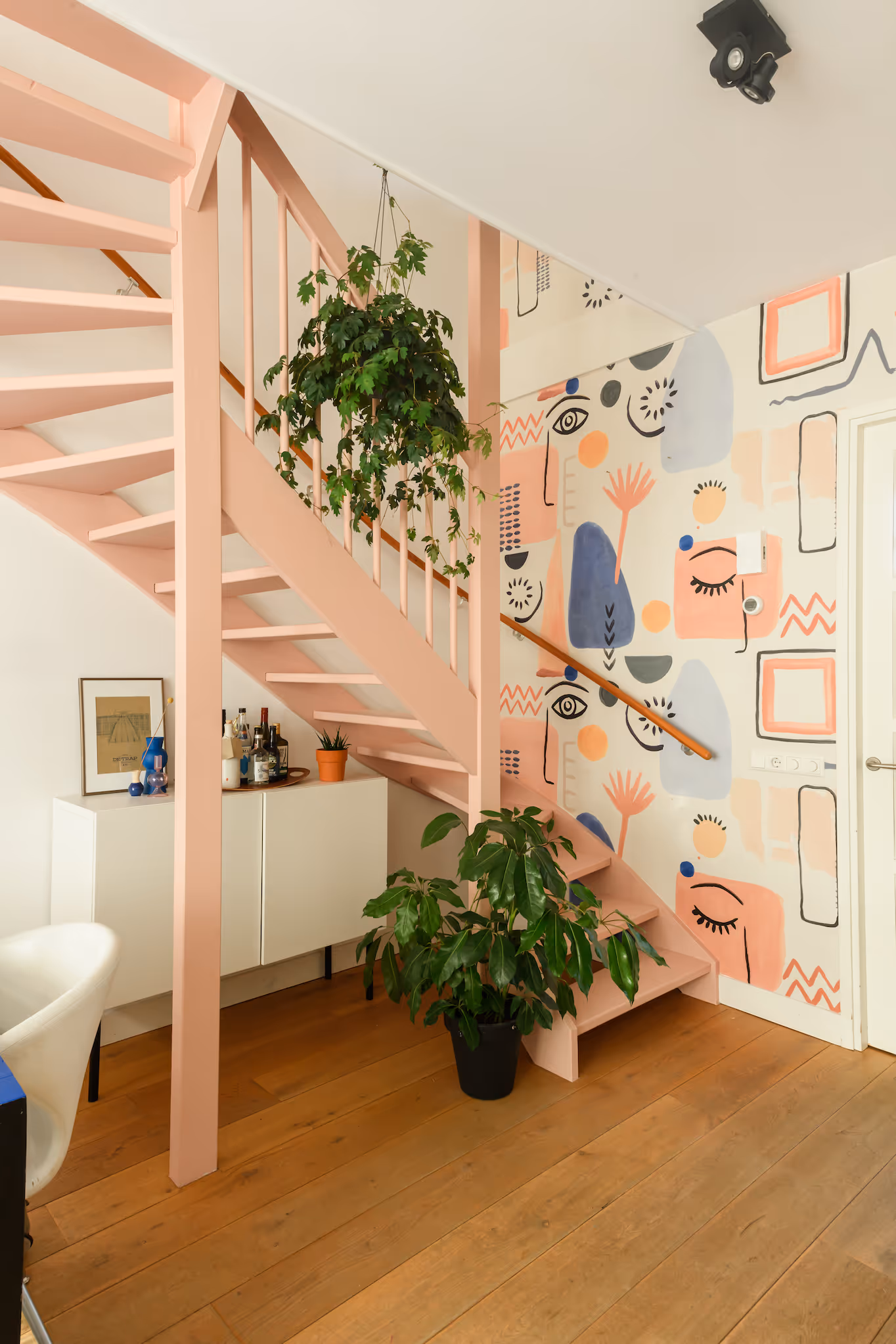Voor dit vrolijke gezin met 3 kinderen hoeft het niet te serieus. Ze houden van kleur en er mocht wat meer fun in het interieur. In het mooie huis van Mirjam en Chris heb ik kleuradvies en materiaaladvies gegeven voor de hal en keuken. Ze hebben een rustige basis waar veel kleur bij past. In de hal zijn het plafond en de muren geverfd, dit geeft deze hal echt veel warmte. Het vrolijke behang is in de gang en in keuken aangebracht. De trap is roze geverfd en is een echte eyecatcher geworden. In de keuken is een kobaltblauwe strook boven het aanrecht geverfd en hebben ze ook de tafel blauw geverfd, dit maakt de grijze keuken lekker fris.
