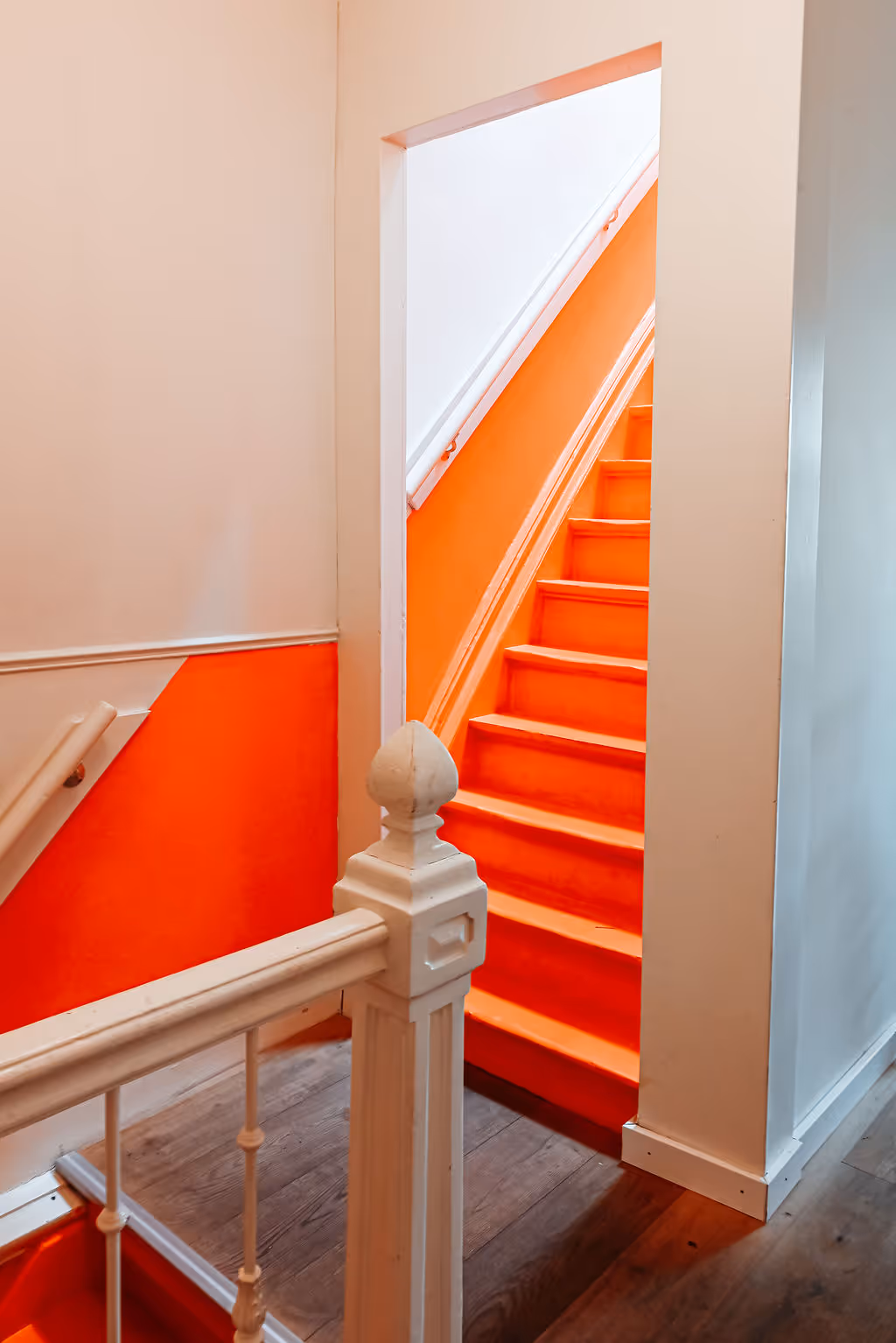 Binnenkomen doe je via een trappenhuis met een knaloranje trap, en boven word je meteen verrast door een toffe print op de muur. Het interieur zit vol fris kleurgebruik, verrassende details en een knipoog naar hun werk in de publieke ruimte.