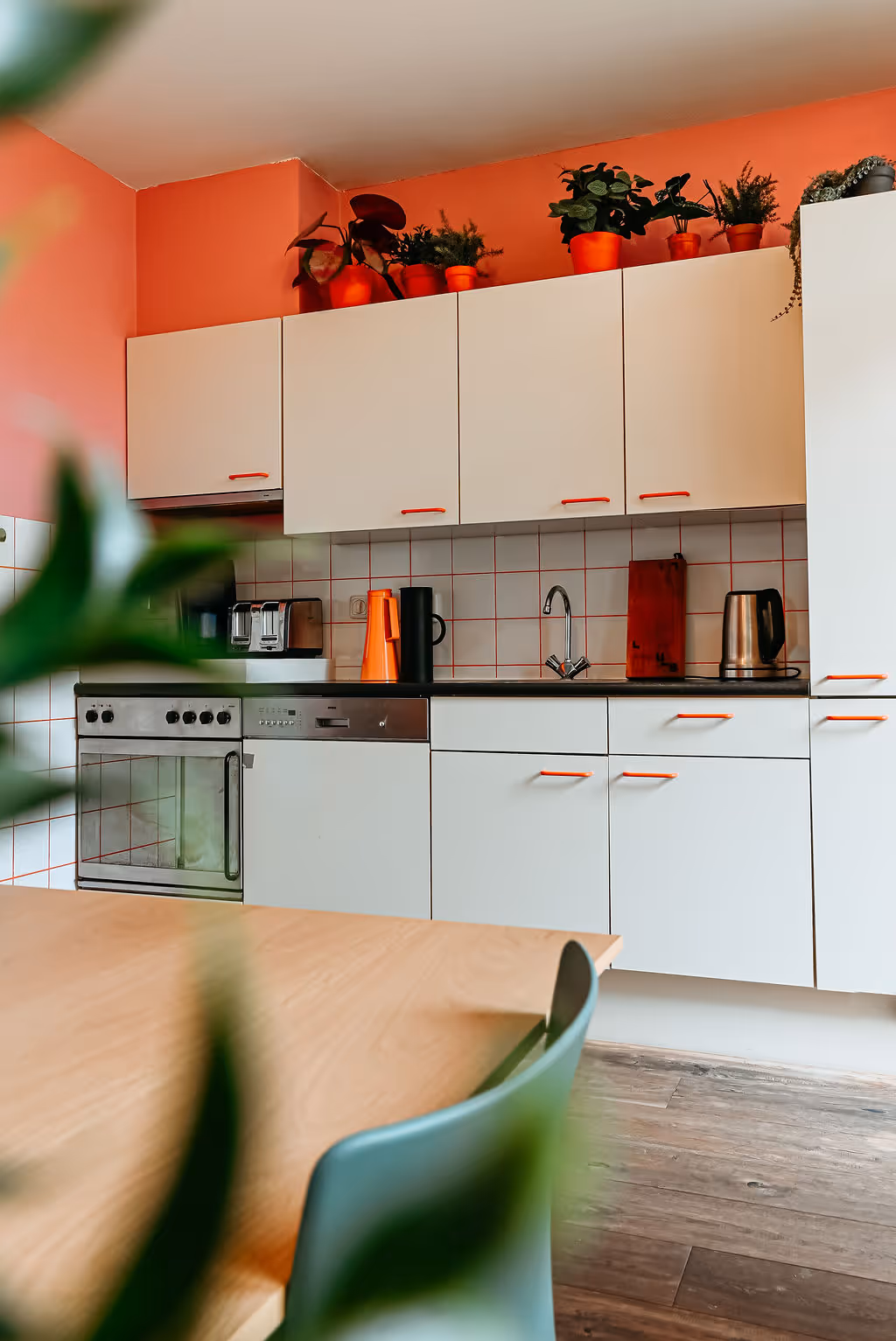 De grote eettafel nodigt uit tot samen lunchen en vergaderen – comfortabel en sfeervol. De keuken kreeg een opfrisbeurt met oranje voegen, roze accenten en een flinke dosis planten. Zo voelt het kantoor warm, eigen en levendig aan – helemaal passend bij deze opdrachtgever.
